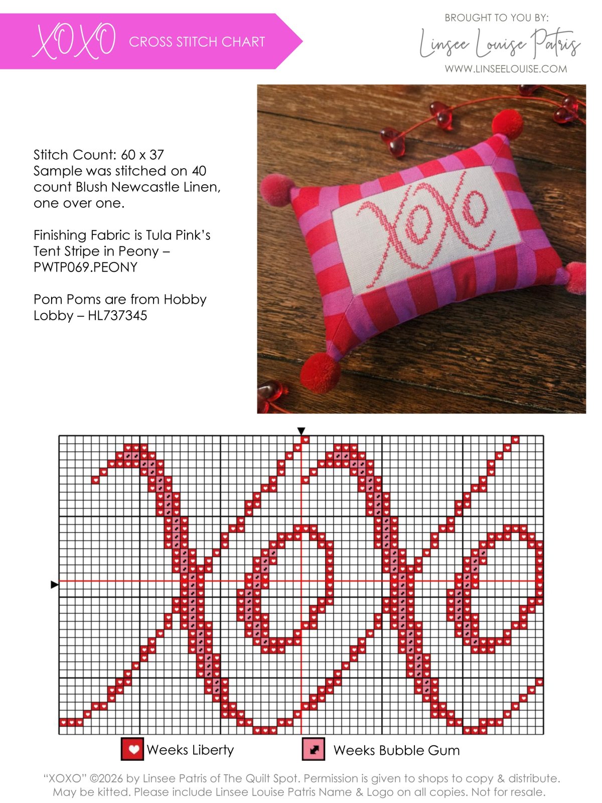 XOXO!!!! I love working with stripes. I love how they can make other shapes and merge lines so your eyes follow a second path. This Tula Pink Fabric is one of my favorites. It used to be taboo to put pink and red together but I LOVE IT! This chart was something I couldn't get out of my mind so here it is! The pom poms are a little extra but I couldn't help myself.